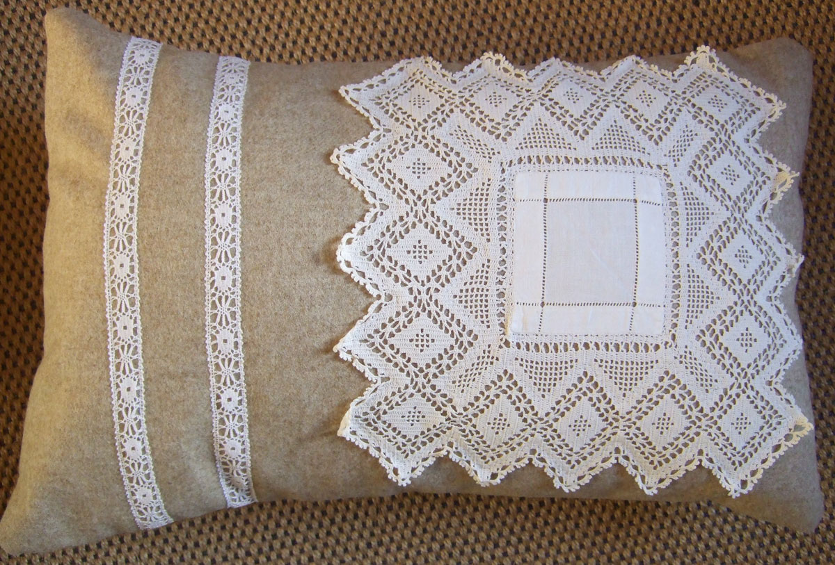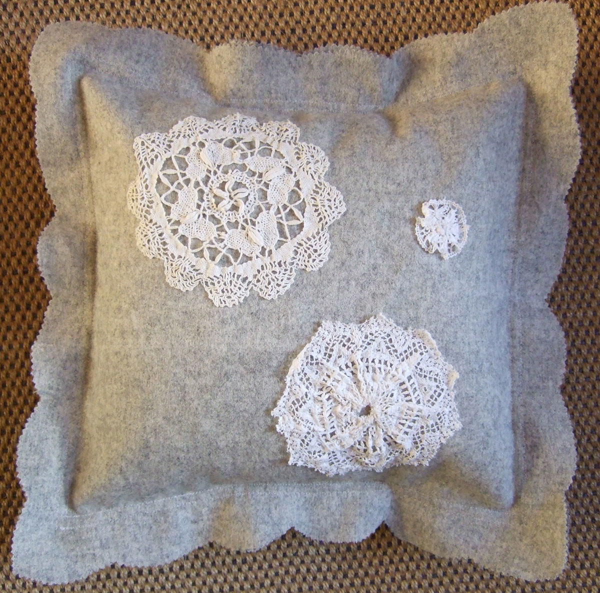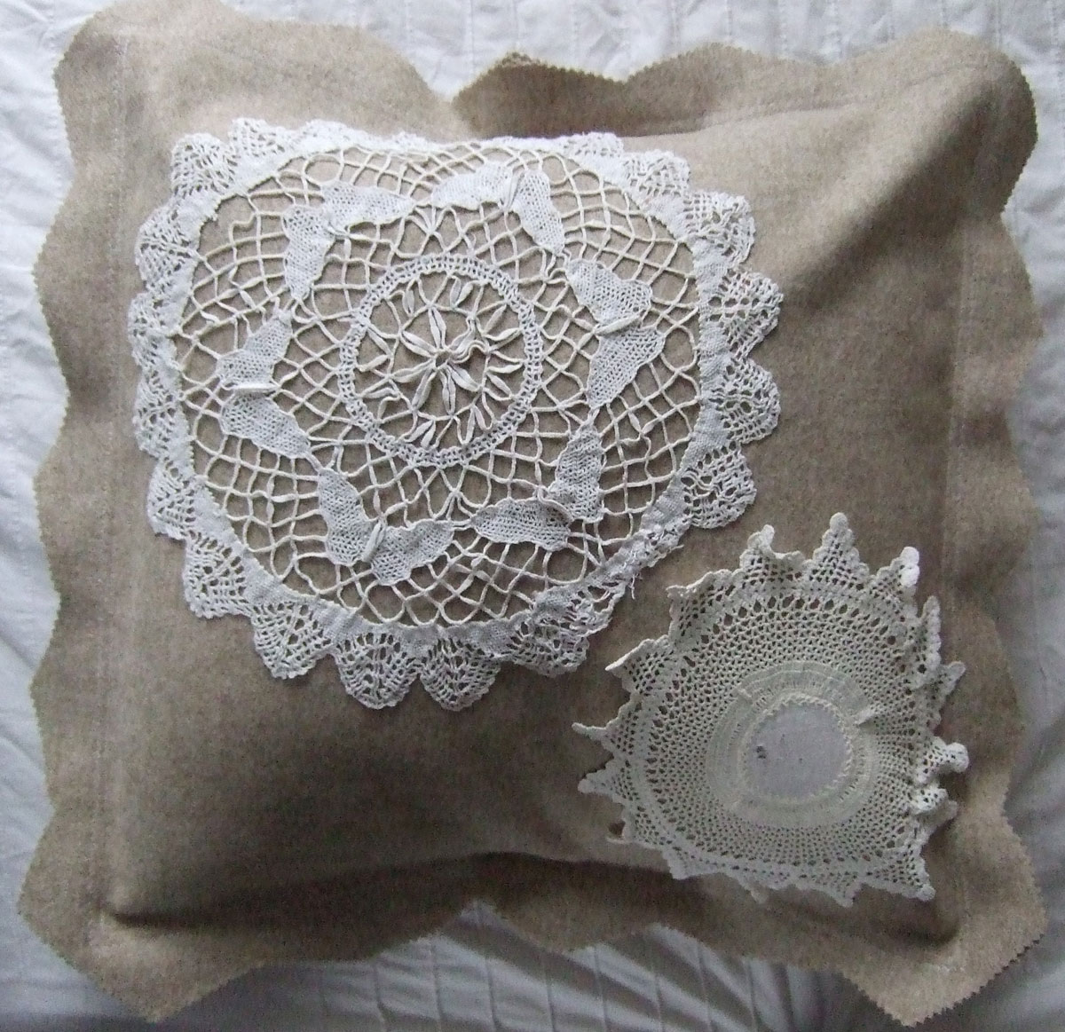 I have made some cushion covers from remnants of woolen fabric, lace and vintage lace doilies. They are in a range of shapes and sizes. These and other meeni creations are for sale in my Etsy Shop.